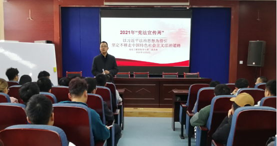 此次活动以播放宪法条例视频讲解的形式开展,选取多条宪法从多个角度介绍宪法如何保护人民、社会、国家的合法权益。例如:宪法第一条明确规定我们的社会制度,保障我们的社会主义制度体系;第九条规定国家自然资源是公共财产,任何人不能独占和破坏,保护国家权益等;第十三条保护人民个人私有财产,维护人民权益。在宪法的保护下,我们的生活、社会、国家规范运转。所以我们应当知法、守法。