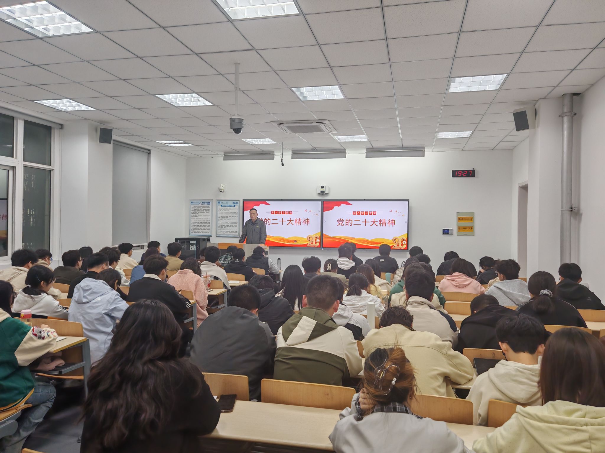 太阳成集团tyc122ccvip组织员乔海东以“深入贯彻党的二十大精神”为题,进行第一讲。他从关键时刻召开的十分重要的会议、党的二十大报告的主要内容核心要义、全面学习贯彻党的二十大精神三方面进行全面解读。他希望同学们提高政治站位,衷心拥护“两个确立”,增强“四个意识”,坚定“四个自信”,做到“两个维护”,深入学习宣传贯彻党的二十大精神,认真学习研读原文,准确把握精神实质,深入了解其内涵和意义,弘扬伟大建党精神,把学习党的二十大精神的成果转化为奋进新征程、建功新时代的实际行动。