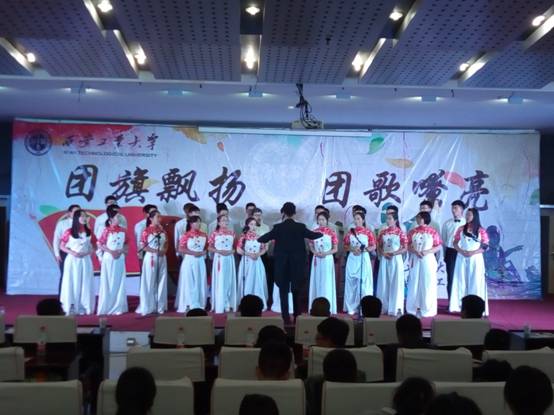比赛中,各院系代表队凭借一首必选曲目《光荣啊,中国共青团》和一首自选曲目在舞台上展开激烈比拼。同学们精神饱满,意气风发,用歌曲、朗诵、舞蹈等形式表达了对中国共产主义青年团的热爱,唱出了广大青年团员对青春的赞歌。公司最后一个出场,以一曲《我爱你中国》唱出了对伟大祖国的热爱,唱出了我们的青春梦想,也感染了在场的每一位观众。