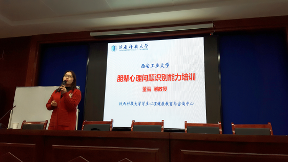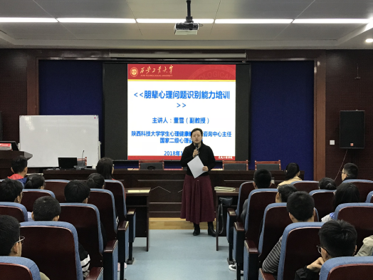 此次讲座老师为陕西科技大学员工心理健康教育与咨询中心主任董雪副教授。公司党委副书记陈彤、全体辅导员、部分班主任、2018级心理委员及宿舍心理信息员、班长、团支书及2018级班长、团支书及部分研究生共计140余人参加与聆听了此次讲座。