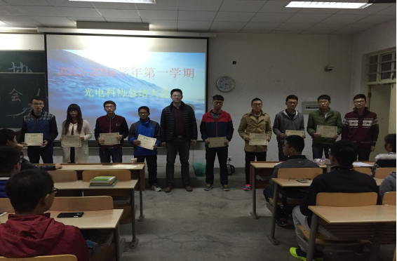 会上,院科协主席高祥首先对2015-2016第一学期科协的工作进行了总结,对今后的工作提出了努力方向。对在工作中表现优异的个人和集体进行了表彰,李睿老师给他们颁发了证书及奖品。随后,科协各部长对本学期的工作分别进行了汇报,并提出了下一步的工作思路。各部门干事的代表也分别谈了在科协这一学期的收获与感受。最后李老师总结发言,对科协本学期的工作给予了充分的肯定,他说,科协的各部门能够尽职尽职做好本职工作,在各部门团结协作,共同努力下,公司的科协工作取得了一些的成绩,如高祥同学在2015年第十届全国老员工“飞思卡尔”杯智能汽车竞赛中获得三等奖。何生君,宋娇,唐莉在陕西省”光电杯“光电信息创新创意大赛中获得二等奖等,这些成绩的取得会加更激励科协今后的工作。还成功举办了“金秋文化节 点亮西工”大型LED灯展等大型活动,师生反响良好。他同时还指出,科协工作还有一些不足,今后需要改进和完善的地方,如要强化专业知识,积极拓宽思路,用于开拓创新。希望各部门发扬优点、弥补不足,不断总结提高,争取在以后的工作中取得更优异的成绩。