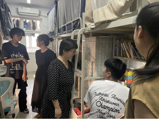 宿舍是员工们的“校园家”,直接影响员工们的学习、生活质量。杨利红进入宿舍后,先对宿舍水电、门窗、床柜、空调等基础设施进行查看,充分确认宿舍安全。对于存在的卫生死角或安全隐患设施,及时给员工指出问题并提出整改意见,确保同学们学习生活环境舒适、安全。