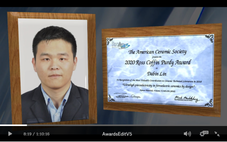 近日,美国陶瓷学会在线颁发了2020年度国际陶瓷学领域各奖项,太阳成集团tyc122ccvip林大斌博士获美国陶瓷学会授予的Ross Coffin Purdy(罗思•科芬•珀迪)奖(https://ceramics.org/awards/ross-coffin-purdy-award)。