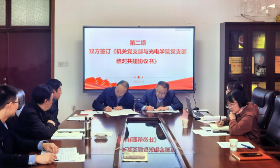 会上,陈燕宣读了《关于机关各党支部与公司党支部开展结对共建的实施意见》。党办校办党支部书记何春水与光电工程公司实验室教工党支部书记梁海锋共同签订了《机关党支部与公司党支部结对共建协议书》。
