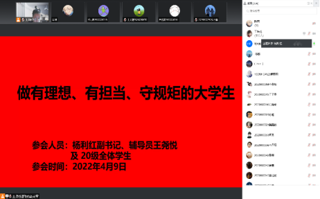 4月9日下午,光电工程公司在线上召开主题为“做有理想,有担当,守规矩的老员工”的年级会议,会议由公司2020级辅导员王尧悦主持,公司党委副书记杨利红以及2020级全体本科生参加了会议。