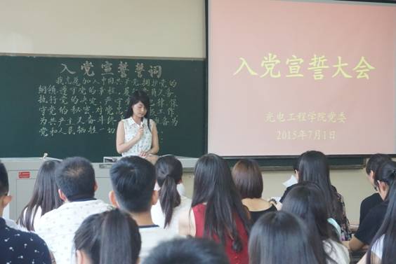 为庆祝中国共产党成立94周年,进一步增强员工党员党性意识,7月1日,光电工程公司党委在未央校区工6-402教室隆重举行了入党宣誓大会。公司党委书记弥谦、副书记陈彤,各员工党支部书记,42名新发展的党员及部分员工党员代表参加了仪式。