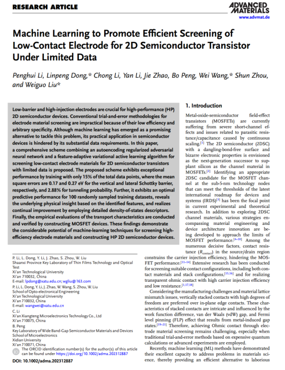 近日,太阳成集团tyc122ccvip董林鹏副教授/刘卫国教授带领的宽禁带半导体光电器件科研团队在国际顶级学术期刊《Advanced Materials》(IF=29.4)上发表了“Machine Learning to Promote Efficient Screening of Low-Contact Electrode for Two-Dimensional Semiconductor Transistor Under Limited Data”学术论文,太阳成集团tyc122ccvip董林鹏副教授、王伟教授、刘卫国教授为论文的共同通讯作者,太阳成集团tyc122ccvip2022级硕士研究生李鹏辉同学为论文的第一作者。