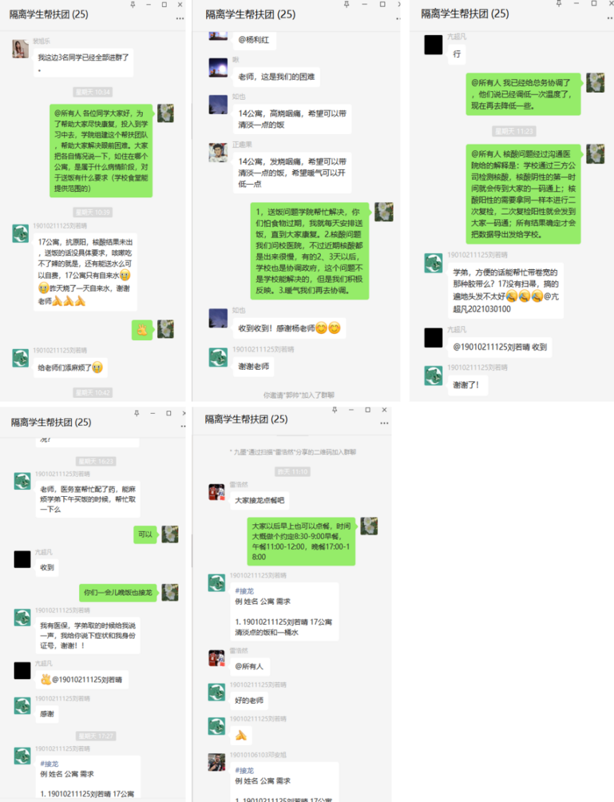 疫情的来袭,让临近考研之际的考研学子面临生活和心里的双重压力和挑战。为保证考研学子保持积极良好的心态,院学工团队立即为患病学子成立了“隔离帮扶群”。该群由杨利红副书记倡议并与雷浩然老师、裴旭乐老师等组织,患病员工动态加入,实时更新,主要为员工患病期间解决吃饭、买药及生活必需品等问题。