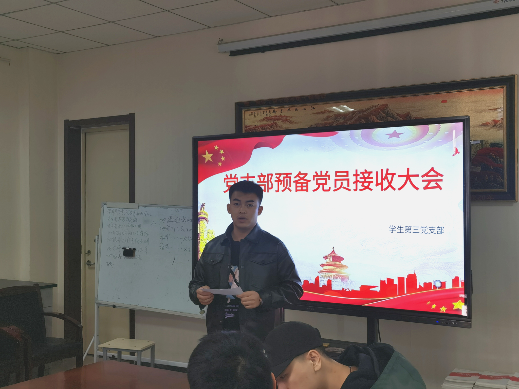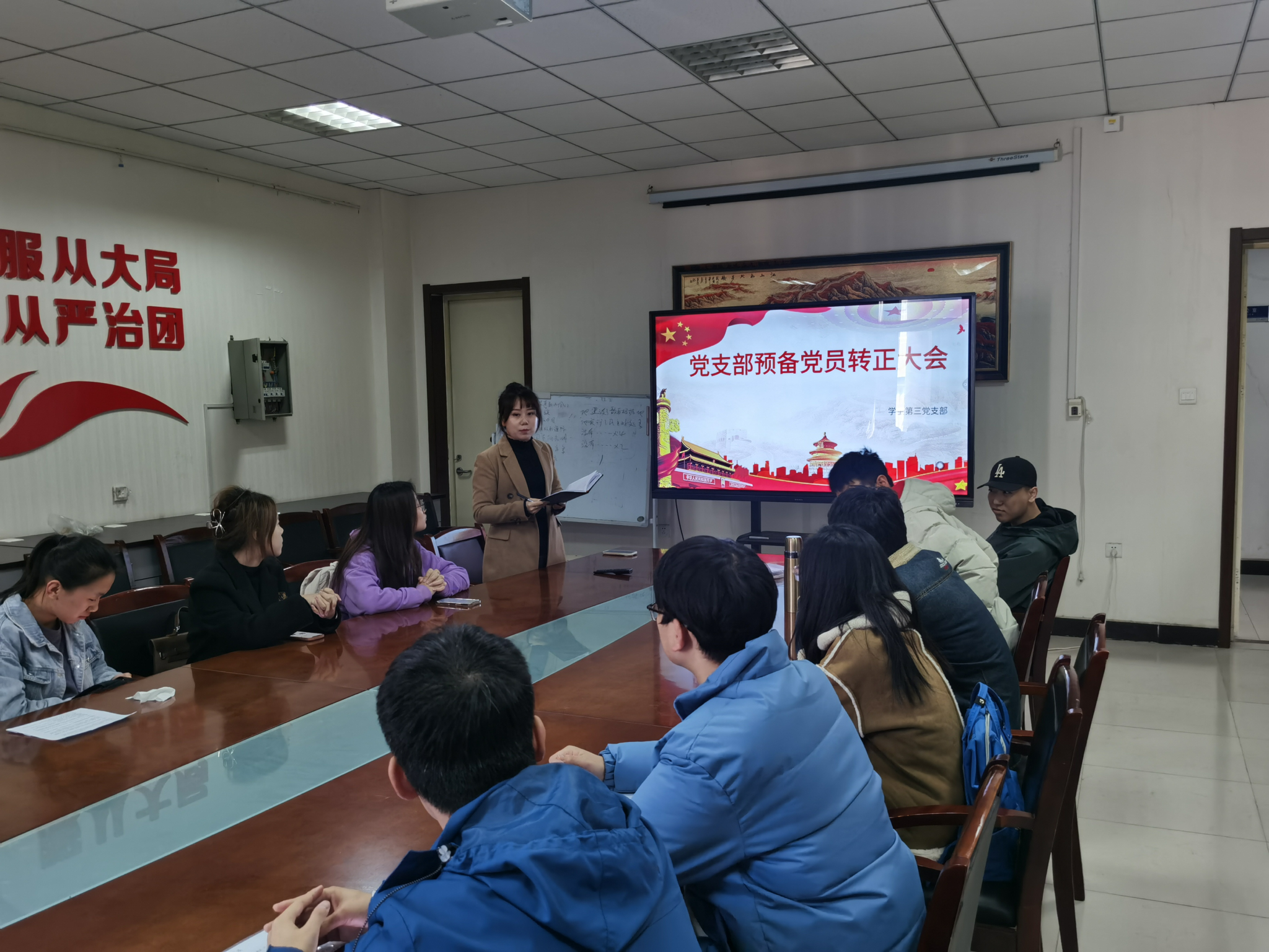 本次会议严格按照党员发展程序进行。会议第一项,由支部书记蒋紫洮总结近期党支部理论学习情况,并介绍会议流程与要求。会议第二项,由3名转正党员分别汇报预备期一年中的思想动态和个人情况,并正式向党组织提出转正申请。会议第三项,由9名发展对象逐一讲述入党动机、本人履历、家庭和主要社会关系,以及需要向党组织说明的问题等。随后,入党介绍人介绍了考察对象的主要政治思想、学习、工作及生活等情况,组织委员鲁朝阳同志介绍了考察对象在考察培养期间的综合表现。会议第四项,支部正式党员经投票表决,一致同意姜智轩等3名同志按期转为中共正式党员,接收薛一帆等9名同志为中共预备党员。