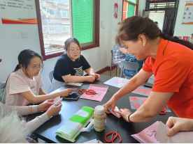 非遗传承人剪纸老师王淑敏、刺绣老师王春莉通过理论讲解与现场演示,带领学员走进剪纸与刺绣的艺术世界。剪纸课堂上,老师从叠纸、纹样设计、到剪刻技巧层层拆解,一幅幅象征女同志胞们团结进取,不忘初心的三折“国际妇联标志”图案在学员手中逐渐成型;刺绣环节中,老师以陕西本土刺绣风格为基础,教授平针、齐针等传统技法,引导学员在素色布帛上绣出灵动花卉图。青年学子与社区居民积极参与,认真听讲,动手实践,氛围浓厚。